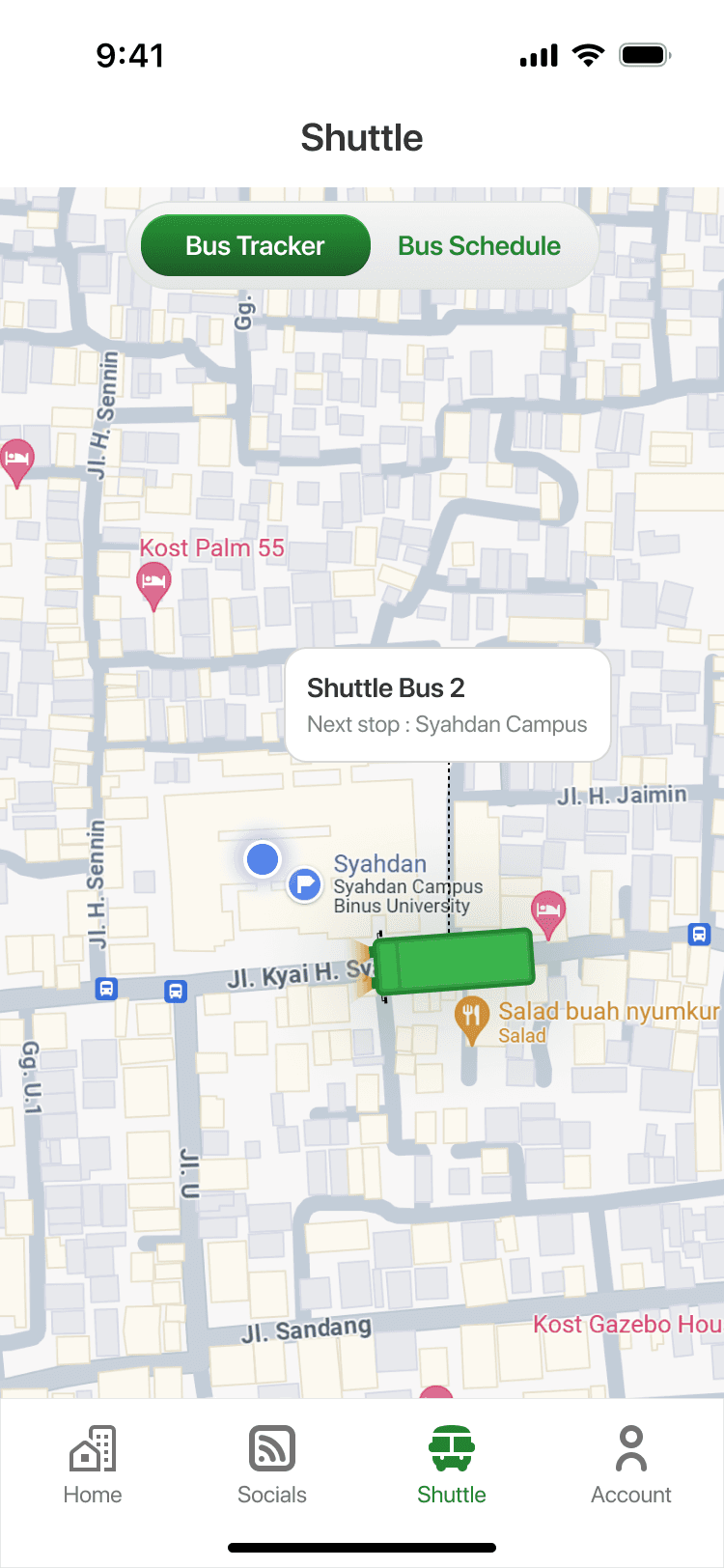 As a boarder of Binus Square, I feel there are a few things that I struggle to use. For example, I want to check the real-time location of the shuttle bus, and at some point, I waited for the shuttle for like 30 minutes and wondered "Where's the shuttle?". This feature helps me to give certainty about my shuttle location.